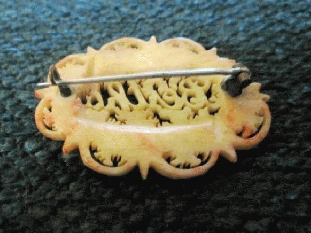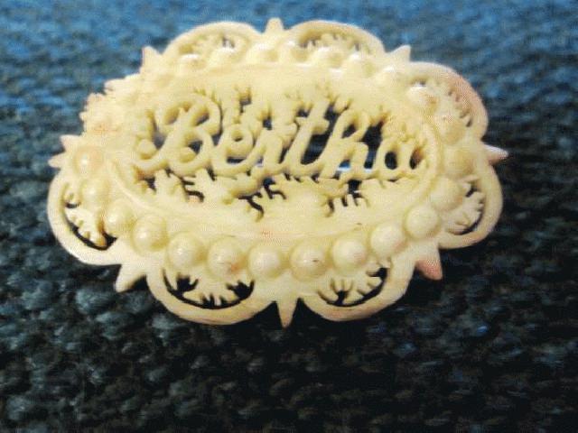 گفتگوی پین بیضی شکل با نام" برتا", احتمالا پلاستیکی, 1 1/2" توسط 1 1/4", تا به برخی از رنگ آمیزی.