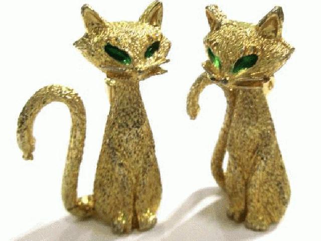 سنجاق سینه حیوانات زن. 2 گربه طلا با چشمان سبز. وزن: 9.7 dwt/.49اونس $79.